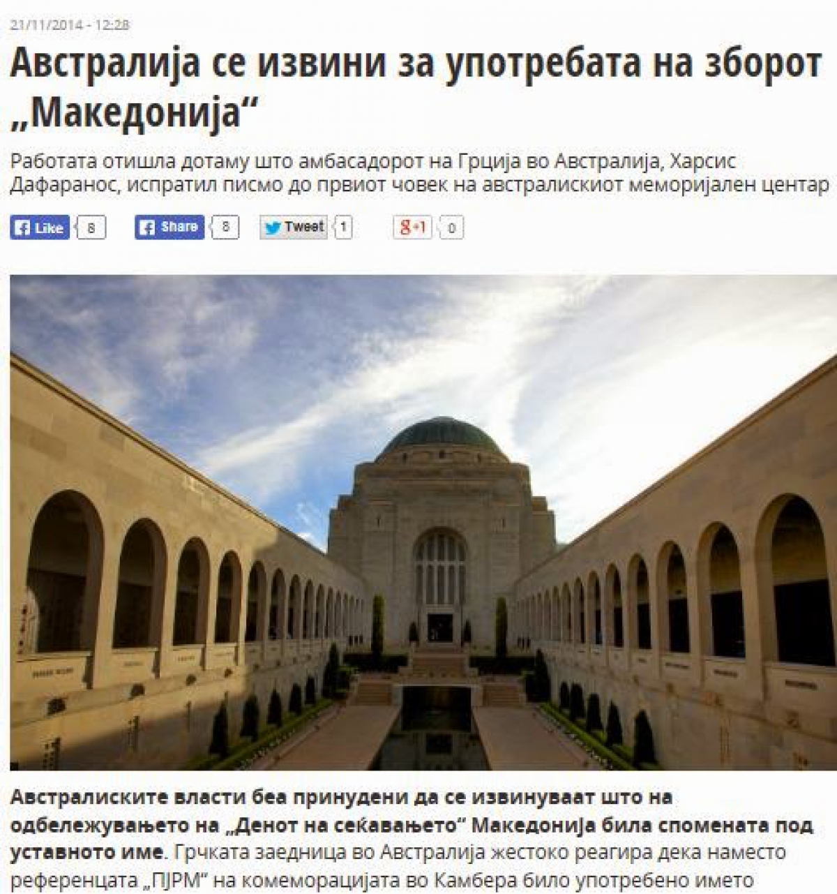 Η ελληνική κοινότητα της Αυστραλίας αντέδρασε έντονα για την ονομασία αυτή, αντί της αναφορά «FYROM” σε ένα μνημείο στην Καμπέρα που χρησιμοποιήθηκε το όνομα της «Μακεδονίας», όπως αναφέρει η σλαβική των Σκοπίων Telegrafεπικαλούμενη την ελληνική εφημερίδα της Αυστραλίας «Νέος Κόσμος» που κατέγραψε τη βαθιά αναστάτωση που προκλήθηκε στους κόλπους της ελληνικής κοινότητας από την κίνηση αυτήν των αυστραλιανών αρχών.