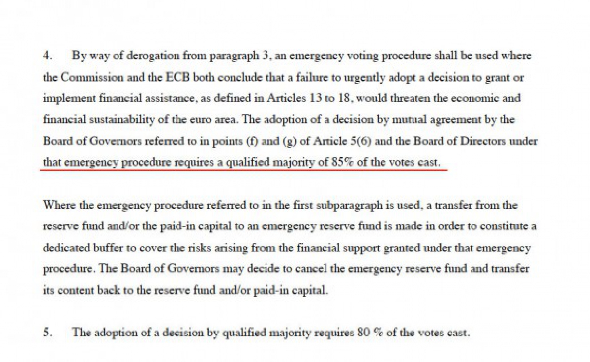 Σύμφωνα με τους κανονισμούς του ESM, για να εγκριθεί ένα πακέτο διάσωσης από τον Μηχανισμό και αν πρόκειται για έκτακτη ανάγκη δεν απαιτείται το 100% των κρατών μελών του αλλά το 85%. Και όχι μόνο αυτό. Στον πίνακα με τα ποσοστα "δυναμικότητας" κάθε χώρας στον ESM, η Φινλανδία έχει μόλις σχεδόν 1,8%, που σημαίνει πως δεν έχει τη δύναμη να ασκήσει βέτο χωρίς τη στήριξη μιας χώρας με μεγαλύτερο ποσοστό, όπως η Γερμανία ας πούμε...