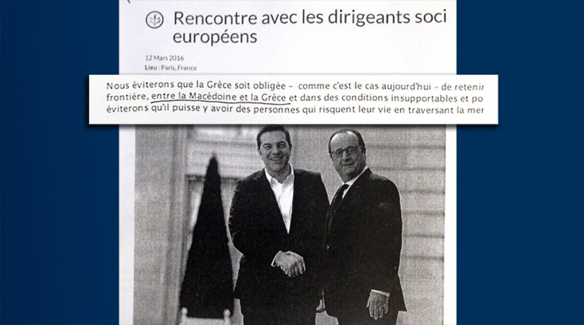Με τον όρο Μακεδονία χωρίς εισαγωγικά ή οτιδήποτε άλλο αναφέρονται τα Σκόπια στο επίσημο ανακοινωθέν της συνάντησης των ευρωπαίων σοσιαλιστών στο Παρίσι, την Παρασκευή 12 Μαρτίου, στην οποία μετείχε και ο Αλέξης Τσίπρας.