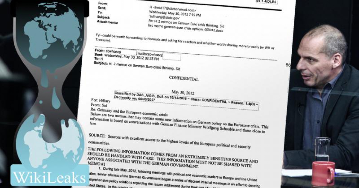 Το Wikileaks την περασμένη εβδομάδα ανέβασε στη βάση του μια σειρά από αποχαρακτηρισμένα ηλεκτρονικά μηνύματα του υπουργείου Εξωτερικών των Ηνωμένων Πολιτειών από την εποχή που υπουργός ήταν η Χίλαρι Κλίντον. Το έγγραφο παρουσιάζει ιδιαίτερο ενδιαφέρον καθώς αναφέρεται στους σχεδιασμούς του Σόιμπλε σε περίπτωση που ο ΣΥΡΙΖΑ έπαιρνε τότε την κυβέρνηση. Διαβάστε το email και το σχόλιο του πρώην υπουργού Οικονομικών, Γιάνη Βαρουφάκη.