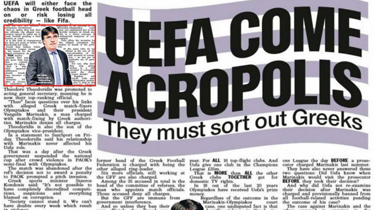 Άρθρο της Sun «λούζει» το ελληνικό ποδόσφαιρο με χαρακτηρισμούς όπως παντελώς αναξιόπιστο, διεφθαρμένο και αχίλλειο πτέρνα της UEFA. Το αγγλικό δημοσίευμα εκφράζει απορίες για το πού καταλήγουν (μέσω της ευρωπαϊκής ομοσπονδίας) τα λεφτά που χρυσοπληρώνουν οι Βρετανοί για το Champions League και αφήνει αιχμές για τις σχέσεις του Βαγγέλη Μαρινάκη με το νέο επικεφαλής της UEFA, Θόδωρο Θεοδωρίδη.