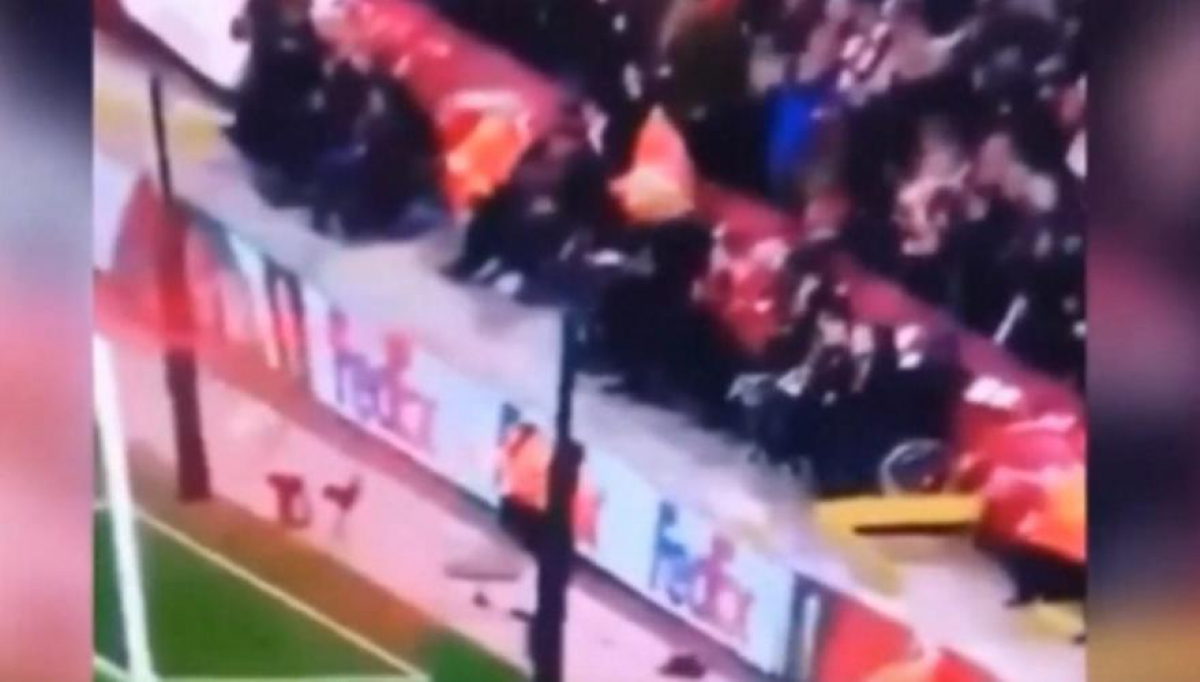 Την ώρα που μπαίνει το τέταρτο γκολ, με το οποίο οι κόκκινοι πήραν τελικά την πρόκριση-θρίλερ, ο άνδρας εκτινάσσεται από το καροτσάκι του πανηγυρίζοντας.