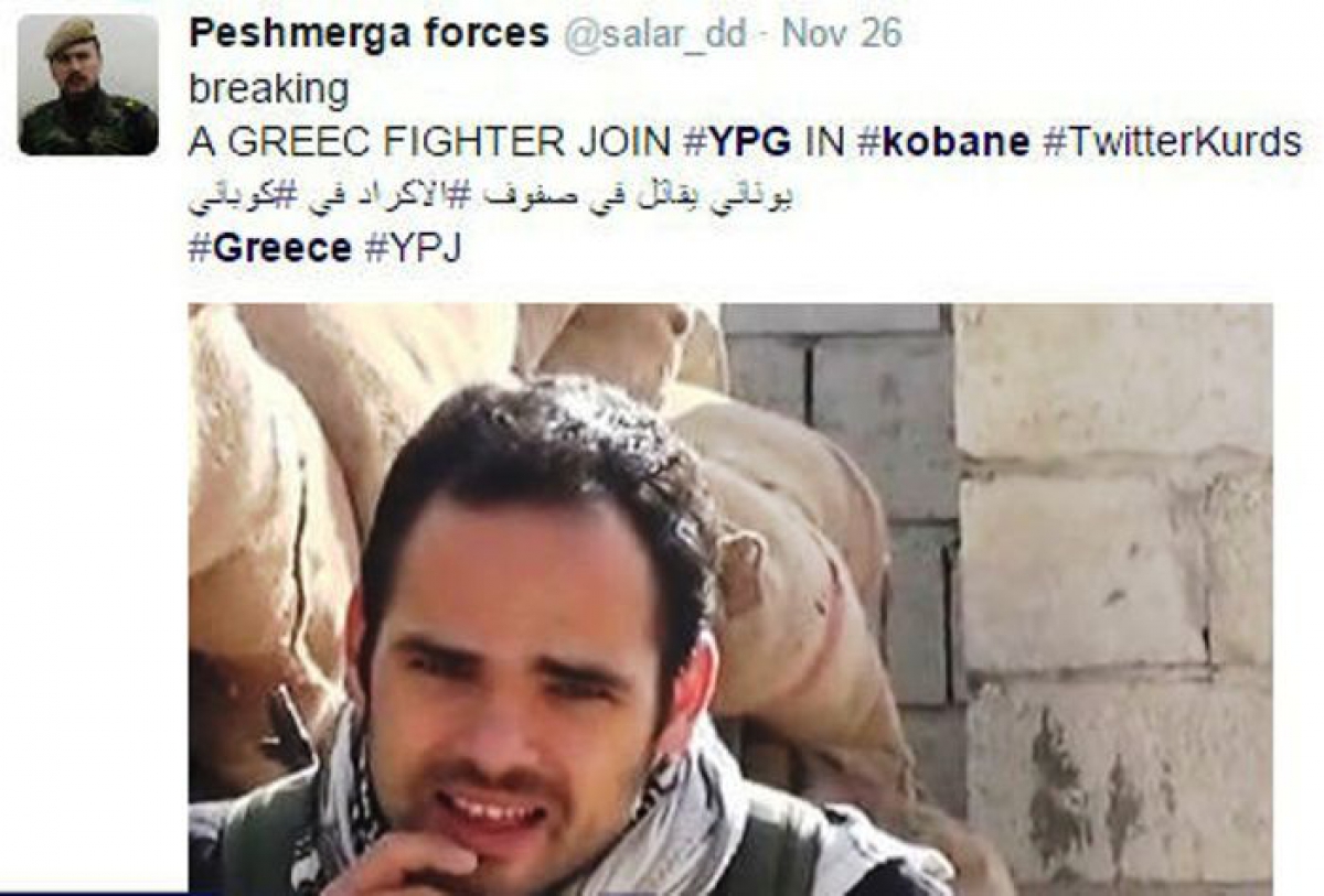 Την είδηση ότι ο πρώτος Έλληνας εθελοντής μπήκε στην πολιορκημένη Κομπάνι και πολεμά με τους Κούρδους του YPG ενάντια στην ISIS, τη μετέδωσαν οι Κούρδοι μέσω Twitter στις 26 Νοεμβρίου.