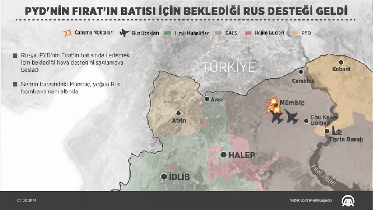 Σύμφωνα με τουρκικά δημοσιεύματα, ο ρωσική πολεμική αεροπορία βομβαρδίζει απο σήμερα την κωμόπολη Μουμπίτς (Mümbiç), που βρίσκεται μεταξύ Τζαραμπλούζ και Αζάζ, χτυπώντας στόχους του Ι.Κ..