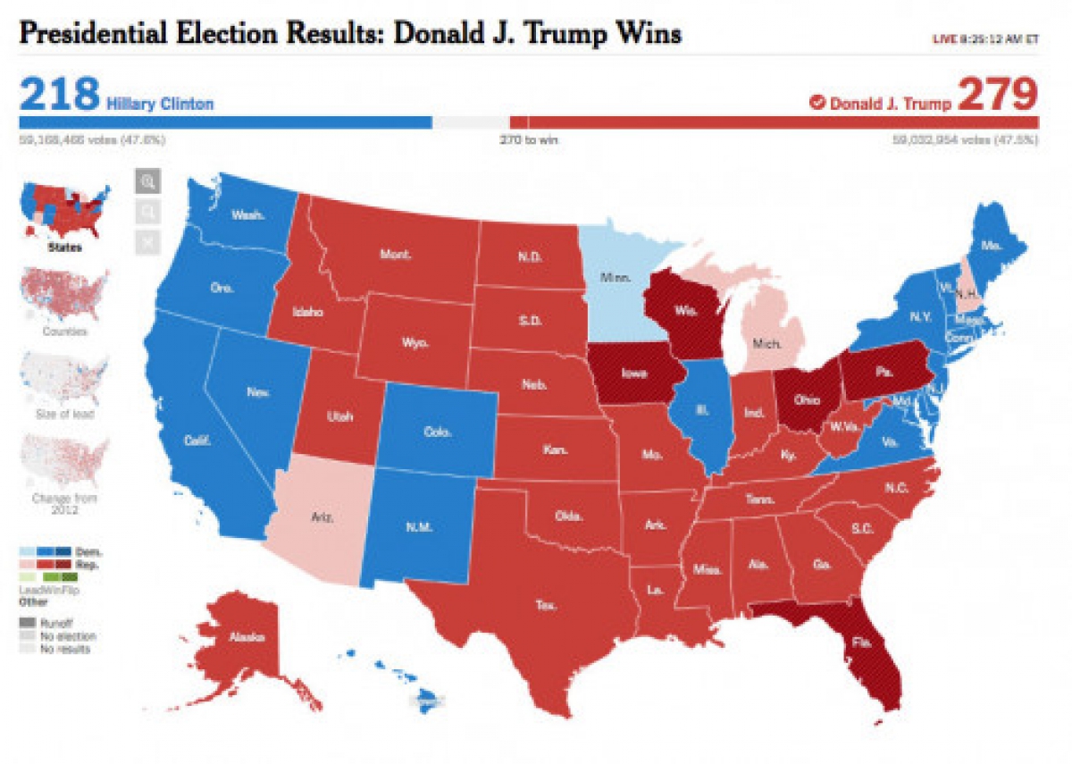 Δηλαδή, η Κλίντον έχει 135,512 ψήφους περισσότερες από τον αντίπαλό της. Αλλά πρόεδρος, δεν εκλέγεται. Αντίθετα, τον Λευκό Οίκο κερδίζει ο Τραμπ γιατί βγήκε νικητής σε πολιτείες κλειδιά, πήρε περισσότερους εκλέκτορες (276 έναντι 218 σύμφωνα με τα μέχρι στιγμής αποτελέσματα), ξεπέρασε το όριο των 270 που απαιτούνταν και είναι ο εκλεγμένος πρόεδρος των ΗΠΑ!