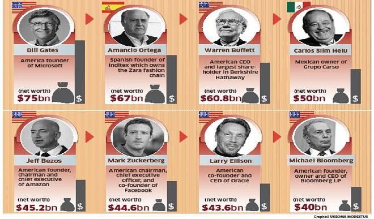Η Oxfam βασίζει τις μετρήσεις της σε στοιχεία από την ελβετική τράπεζα Credit Suisse και το περιοδικό Forbes. Οι οκτώ που κατονόμασε η έκθεση είναι ο Μπιλ Γκέιτς, ο ιδρυτής της βιομηχανίας ρούχων Inditex Αμάνθιο Ορτάγκα, ο βετεράνος επενδυτής Ουόρεν Μπάφετ, ο επιχειρηματίας τηλεπικοινωνιών του Μεξικού Κάρλος Σλιμ, ο διευθυντής της Amazon Τζεφ Μπέζος, ο διευθυντής του Facebook Μαρκ Ζούκερμπεργκ, ο συνιδρυτής της τεχνολογικής εταιρείας Oracle Λάρι Έλισον, και ο πρώην δήμαρχος της Νέας Υόρκης Μάικλ Μπλούμπεργκ.