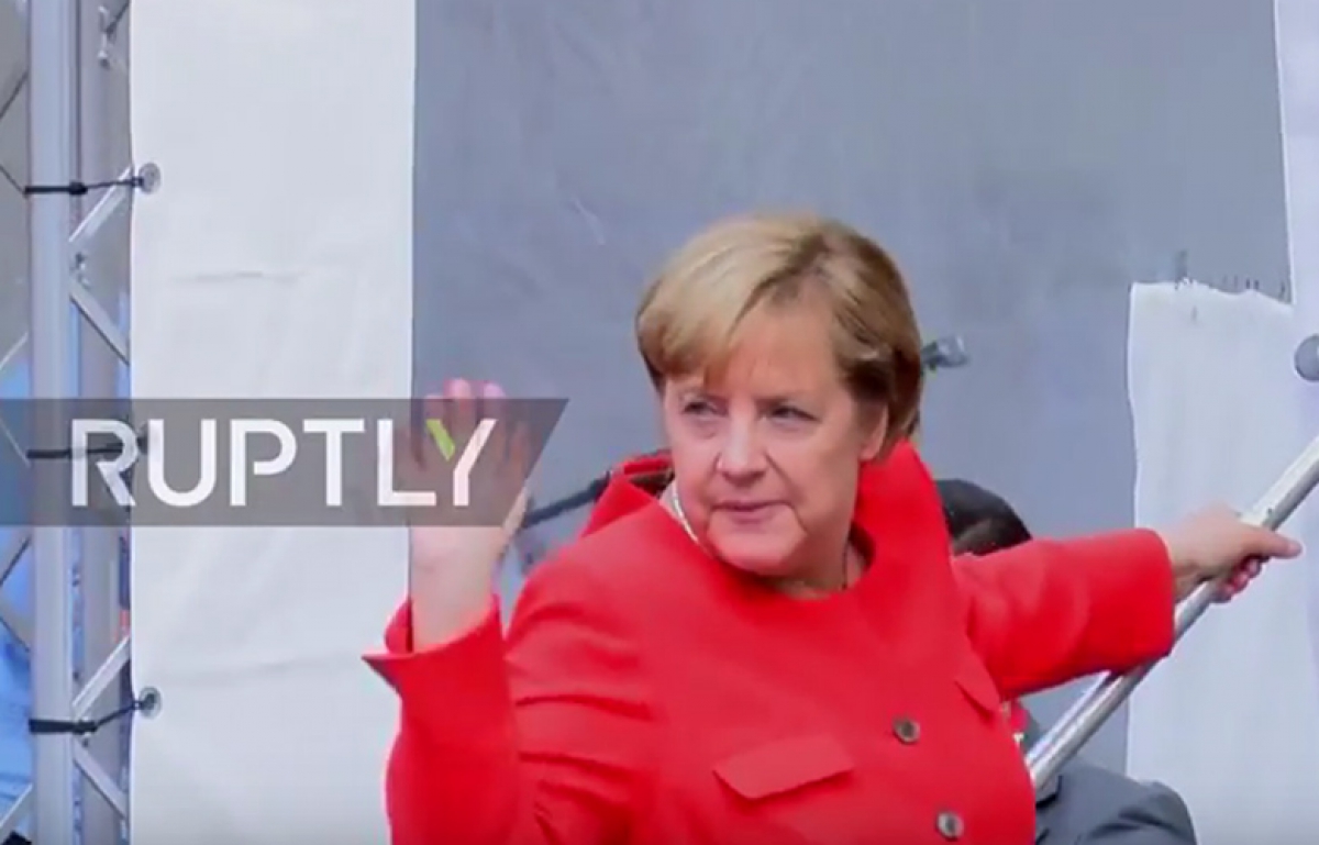 Ευτυχώς φορούσε κόκκινο σακάκι... Η Άνγκελα Μέρκελ δέχτηκε ένα καλοκαιρινό λαχανικό, δυο κατακόκκινες ντομάτες, από χέρι διαδηλωτή κατά τη διάρκεια της προεκλογικής της εκστρατείας.