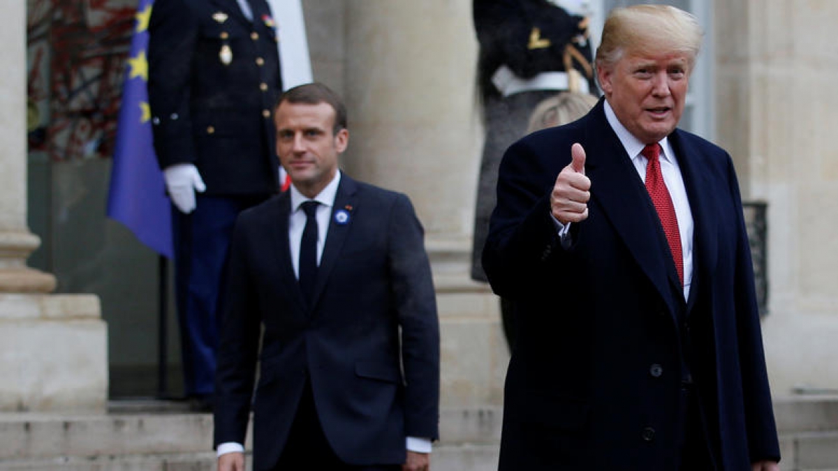 Κατά τη συνάντησή τους για συνομιλίες στο γαλλικό προεδρικό μέγαρο των Ηλυσίων μια ημέρα πριν από τις τελετές για την 100η επέτειο από το τέλος του Πρώτου Παγκοσμίου Πολέμου, ο Μακρόν καλωσόρισε με μια σφιχτή χειραψία τον Τραμπ κάτω από τον βροχερό παρισινό ουρανό. Όμως ο χαιρετισμός τους φάνηκε να είναι λιγότερο εγκάρδιος σε σχέση με την προηγούμενη συνάντησή τους.
