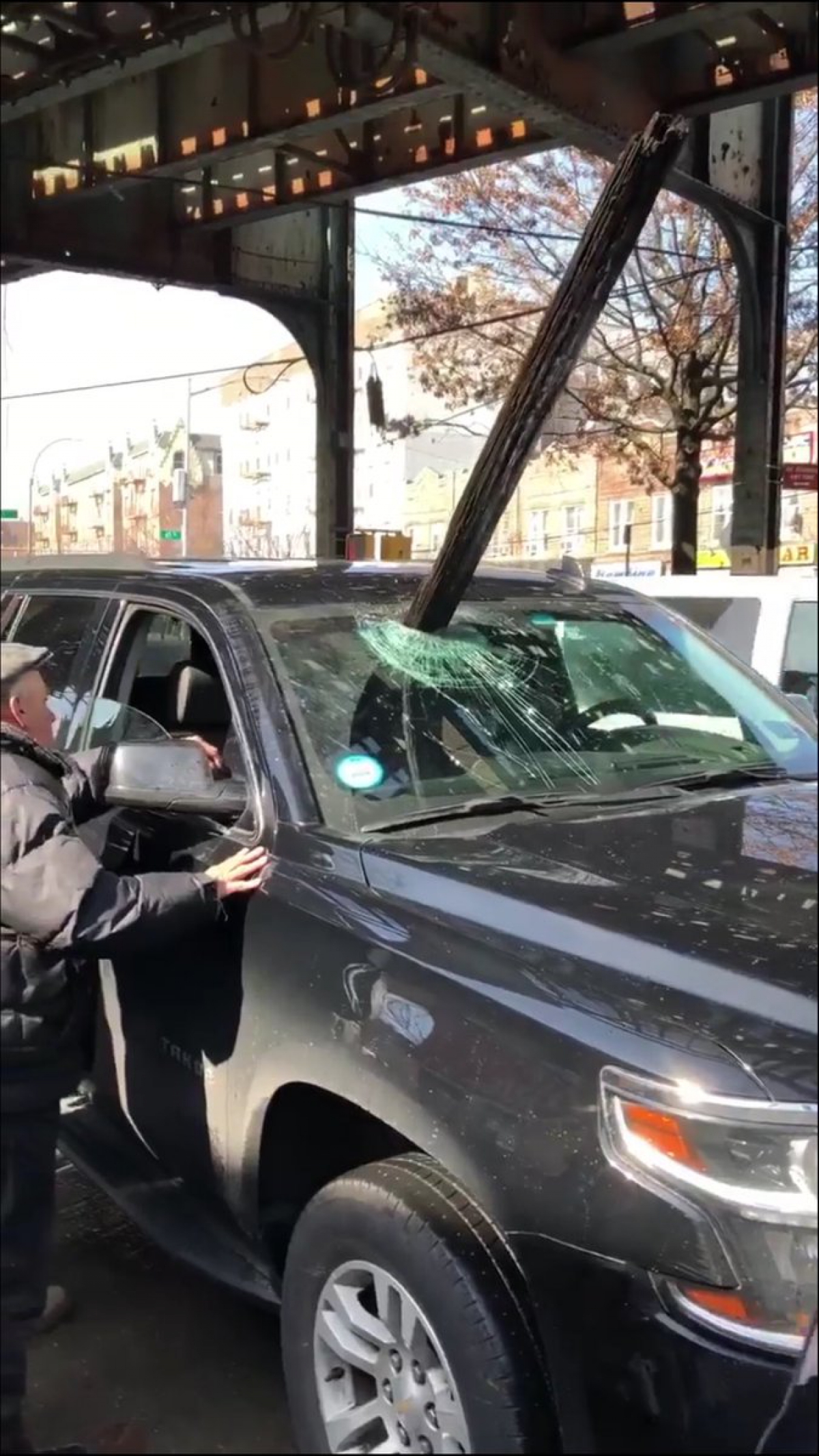 Σύμφωνα με την Αστυνομία, το περιστατικό συνέβη την Πέμπτη, στην 65η οδό στο Γουντσάιντ, όταν ξαφνικά το κομμάτι από τις ράγες άρχισε να... ίπταται. Ασφαλώς, από θαύμα δεν υπήρξε θανάσιμος τραυματισμός αφού, εκτός από τον οδηγό, θα μπορούσε, για παράδειγμα, να έχει πέσει πάνω σε διερχόμενο πεζό, με ό,τι αυτό συνεπάγεται.