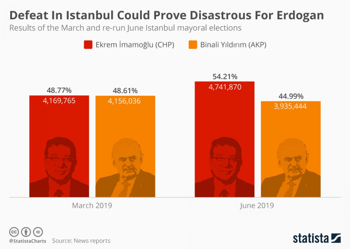 Ο Ιμάμογλου εξελέγη δήμαρχος της Κωνσταντινούπολης με περίπου το 55% των ψήφων, ένα από τα υψηλότερα ποσοστά που έχει συγκεντρώσει υποψήφιος της αντιπολίτευσης σε πρόσφατες εκλογές. Δεδομένου ότι ο Ερντογάν είναι εκείνος που έχει πει "Εκείνος που κερδίζει την Κωνσταντινούπολη, κερδίζει την Τουρκία", ο τούρκος πρόεδρος υπέστη μια από τις πιο επώδυνες ήττες της μακράς πολιτικής του καριέρας.