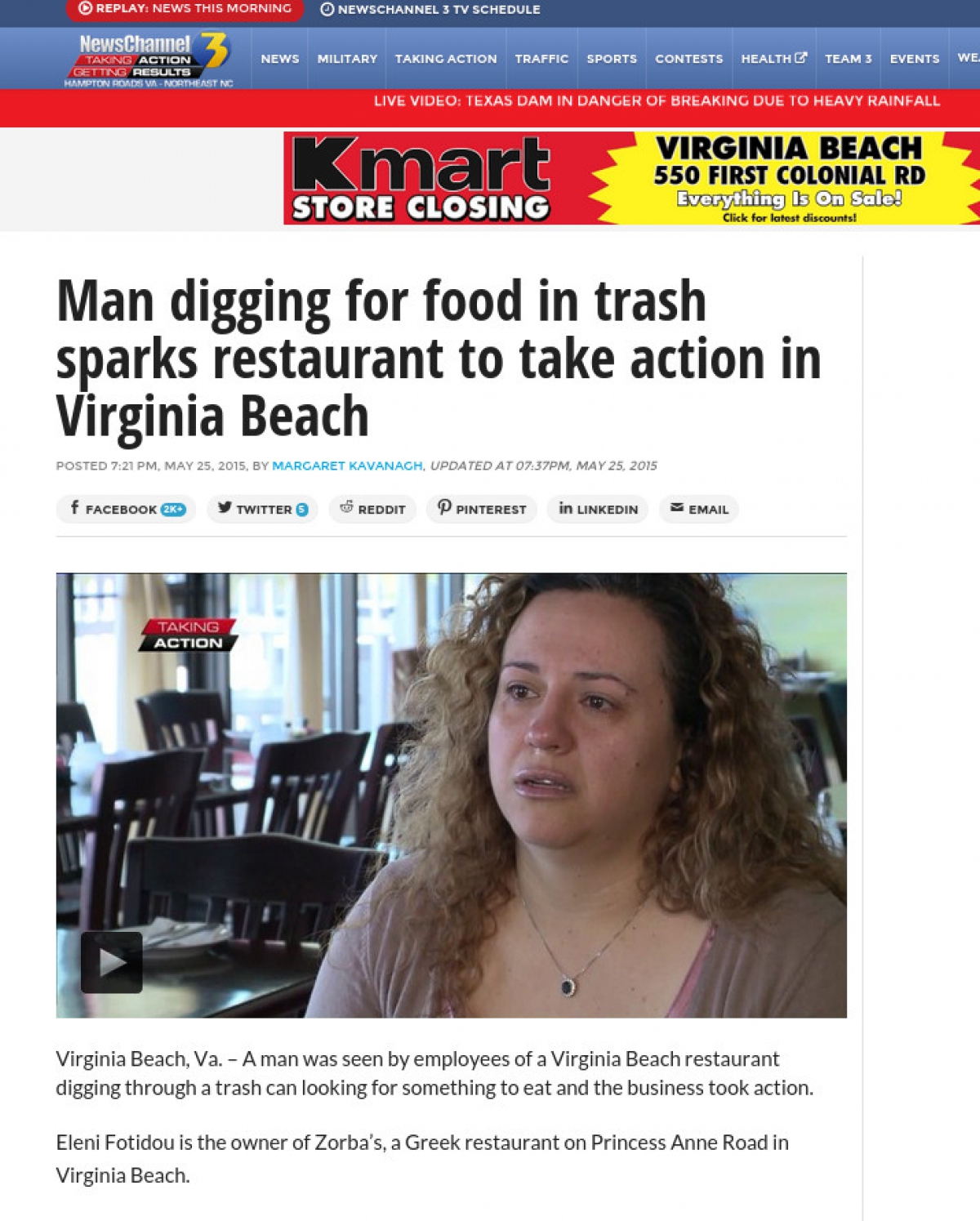 Πριν από κάποιες ημέρες, έξω από το εστιατόριο «Ζορμπάς» της Ελένης Φωτιάδου, στο Βιρτζίνια Μπιτς, συνέβη κάτι που λύγισε όλη τη γειτονιά: Ενας άνδρας έψαχνε στα σκουπίδια του μαγαζιού για να βρει κάτι να φάει.