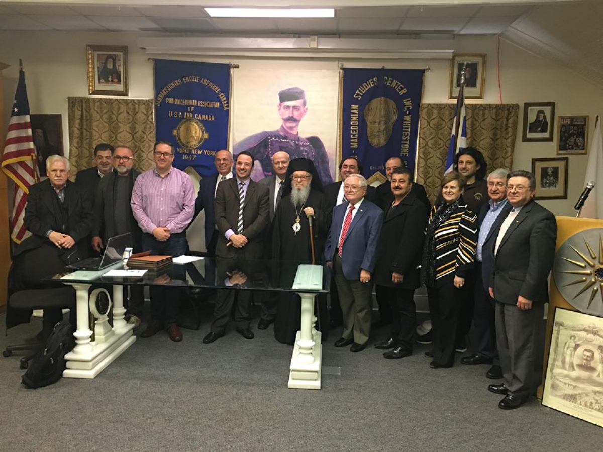 Παράλληλα, το Σάββατο 24 Φεβρουαρίου 2018, Ο Σεβασμιώτατος Αρχιεπίσκοπος Αμερικής κ. Δημήτριος, προσκληθείς από την ηγεσία της Παμμακεδονικής Ενώσεως Αμερικής συμμετείχε σε συνάντηση με το Υπατο Συμβούλιο της Οργάνωσης στο Whitestone της Νέας Υόρκης. Ο Αρχιεπίσκοπος Δημήτριος απεδέχθη την πρόσκληση μας να συμμετάσχει στο συλλαλητήριο και μας διαβεβαίωσε ότι θα κάνει τις απαραίτητες ενέργειες ώστε να υπάρξει σχετική κινητοποίηση από τις κοινότητες της Ιεράς Αρχιεπισκοπής για τη συμμετοχή του κόσμου. Επίσης όπως τόνισε θα γίνουν κινήσεις ώστε και η θεία Λειτουργία της Κυριακής να τελειώσει πιο νωρίς ώστε να διευκολυνθούν οι πιστοί στην μετακίνηση τους προς τα Ηνωμένα Έθνη.