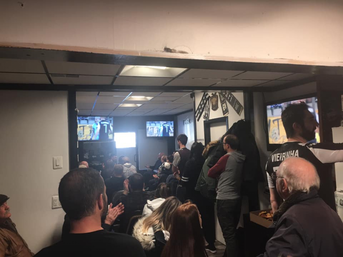 Σε ώρα Νέας Υόρκης, ο αγώνας ξεκίνησε στις 12:30 το μεσημέρι. Στο ισόγειο της συμβολής 23ης Λεωφόρου και 27ης Οδού στην Αστόρια, όπου έχει μεταφερθεί ο Σύνδεσμος - μετά από ενάμιση χρόνο φιλοξενίας του στις εγκαταστάσεις του Συλλόγου Ποντίων, λίγους δρόμους πιο πάνω - οι θέσεις είχαν εξαντληθεί από νωρίς, με πολλούς φίλους του ΠΑΟΚ να στέκονται όρθιοι καθ' όλη την διάρκεια του αγώνα, προκειμένου να παρακολουθήσουν όλοι μαζί τον τελικό Πρωταθλήματος.