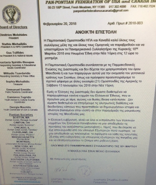 Χαιρετισμό απηύθυναν η πρόεδρος του Συλλόγου Χειμαρριωτών, Άννα Νότη, ο πρόεδρος του Συλλόγου Βορειοηπειρωτών «Πύρρος», Κωνσταντίνος Τσιούρης, ο πρόεδρος της Παλλακωνικής Ομοσπονδίας. Θεόδωρος Παυλάκος, ο πρόεδρος του Συλλόγου Ποντίων «Πόντος» από το Νοργουολκ του Κονέκτικατ, Κώστας Τσιλφίδης, ο πρώην πρόεδρος της Ομοσπονδίας Ελληνικών Σωματείων Μείζονος Νέας Υόρκης, Ηλίας Τσεκερίδςη, ο νυν πρόεδρος της Ομοσπονδίας, Κλεάνθης Μεϊμάρογλου, ο αντιπρόεδρος, Πέτρος Γαλάτουλας, ο πρόεδρος της Παμμακεδονικής Αμερικής, Δημήτρης Φιλιππίδης, ο πρόεδρος του Ιδρύματος «Παναγία Σουμελά, Δρ. Χαράλαμπος Βασιλειάδης και ο Γενικός Πρόξενος της Ελλάδας στη Νέα Υόρκη, Κωνσταντίνος Κούτρας.