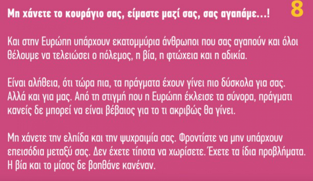 - Το φυλλάδιο ζητεί από τους πρόσφυγες και τους μετανάστες σε Πειραιά και Ειδομένη να κλείσουν τ' αυτιά τους στους διακινητές
