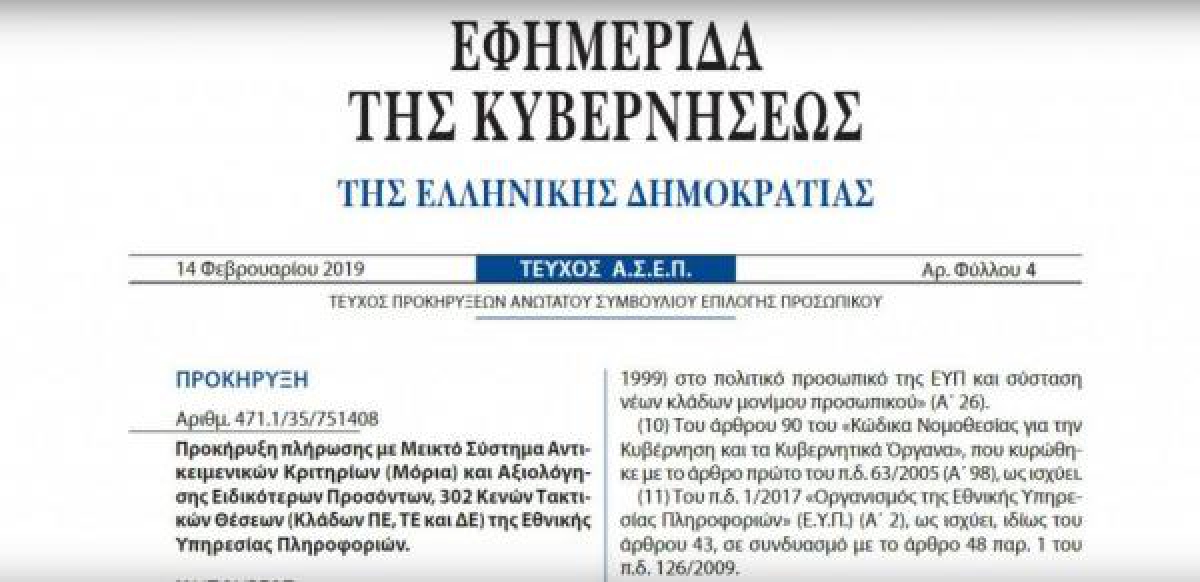Ο διαγωνισμός για 302 προσλήψεις στην Εθνική Υπηρεσία Πληροφοριών φαίνεται ότι «ξεπαγώνει» και οι διαδικασίες θα συνεχιστούν κανονικά, καθώς οι σκέψεις που υπήρξαν για επανάληψή του έχουν εγκαταλειφθεί.